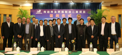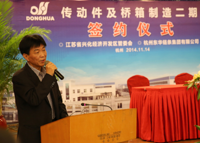 簽約儀式上,董事長宣碧華致辭。他說,東華2007年收購興化齒輪廠,至今已有8年,一直得到了興化市委、市政府和興化開發區的大力支持,使一個當時不太景氣的企業,得到了新生、發展?,F在不僅是鏈條行業,齒輪、鏈輪、變速箱、橋箱將同步發展。今天簽約的興化這個項目,我們考慮了東華發展的增量和存量。增量是我們希望到2020年生產總量翻一番,興化的這個土地就是我們的增量空間。存量有兩塊,一是原來我們在外采購的原材料、零部件,拿回來放在興化生產,保證質量;二是現在臨平三廠區制造鏈條要退二進三,騰籠換鳥,把騰出來的廠房做新的項目,比如傳動件超市、輸送機械、CVT變速箱,所以今天我們在這兒舉行簽約儀式,對東華來講是一個很好的發展機會,具有里程碑意義。