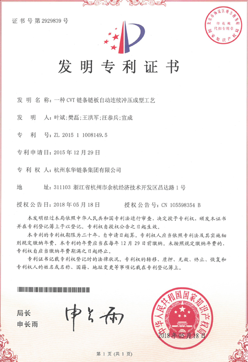 另,201912月,集團知識產權管理體系順利通過中知(北京)認證有限公司的年度監督審核,進一步證實了集團公司知識產權管理體系運行有效性。同時,《2019年度浙江省專利項目績效評價(專利獎)結果公示》,集團公司“一種CVT鏈條鏈板自動連續沖壓成型工藝”發明專利榮獲浙江省專利優秀獎。