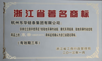 日前,東華集團注冊并使用在7類陸地車輛傳動鏈、摩托車用鏈條、陸地車輛傳動齒輪商品上的“東華”(注冊證號:943174)商標被浙江省工商行政管理局延續確認為浙江省著名商標,有效期三年。這是2004年 “東華”商標被認定為浙江省著名商標后連續被延續確認。