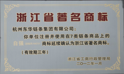 日前,東華集團注冊并使用在7類鏈條商品上的“自強”(注冊證號:1542721)商標被浙江省工商行政管理局延續確認為浙江省著名商標,有效期三年。“自強”商標為東華集團鏈條的三大品牌之一,在國內外鏈條行業享有較高知名度。
