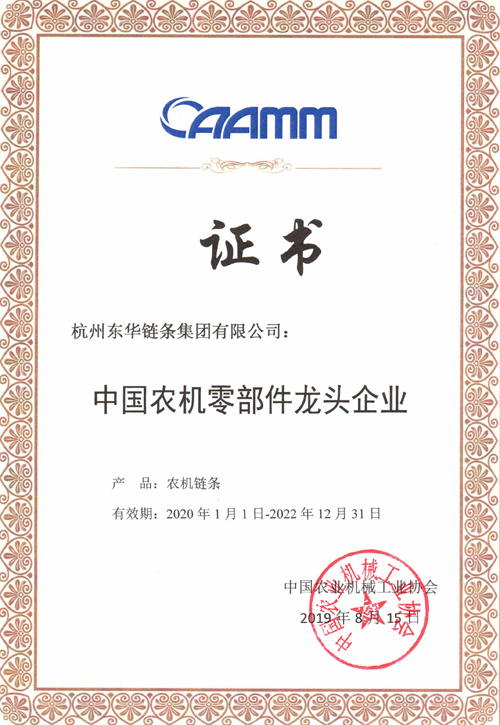 中國農(nóng)機(jī)工業(yè)協(xié)會(huì)從2013年開始,每三年一次組織眾多農(nóng)機(jī)行業(yè)的知名專家,根據(jù)企業(yè)的生產(chǎn)經(jīng)營規(guī)模、市場(chǎng)占有率、品牌影響力等要素,評(píng)選出具有行業(yè)代表性的優(yōu)秀龍頭企業(yè)。東華鏈條分別于2013年、2016年、2019年連續(xù)三屆被授予“中國農(nóng)機(jī)零部件龍頭企業(yè)”稱號(hào),該殊榮是中國農(nóng)機(jī)工業(yè)協(xié)會(huì)打造的行業(yè)品牌榮譽(yù),也是中國農(nóng)機(jī)零部件企業(yè)的金名片。
