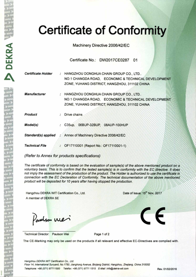 日前,集團公司UP系列標準滾子鏈產品順利通過德國機動車監督協會(Deutscher Kraftfahrzeug überwachungsverein,簡稱為DEKRA)CE認證證書,此認證的順利通過標志著東華升級版標準滾子鏈拿到打開并進入歐洲市場的護照。