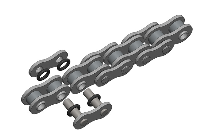 ● O形密封圈滾子鏈互換性尺寸符合ISO標準,與標準鏈輪相匹配;外、內鏈板之間裝有O形密封圈,以防止使用過程油脂流失及雜物進入鏈條軸套間隙,適用于耐磨損要求較高且不能經常加油潤滑的使用環境。